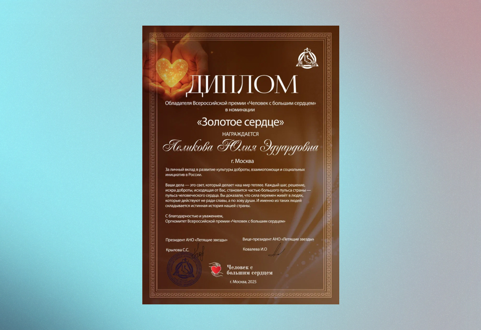Мы поздравляем Юлию и благодарим каждого, чья доброта и отзывчивость помогают менять жизни к лучшему. Награда «Золотое сердце» — это знак доверия, подтверждающий, что выбранный нами путь верен.